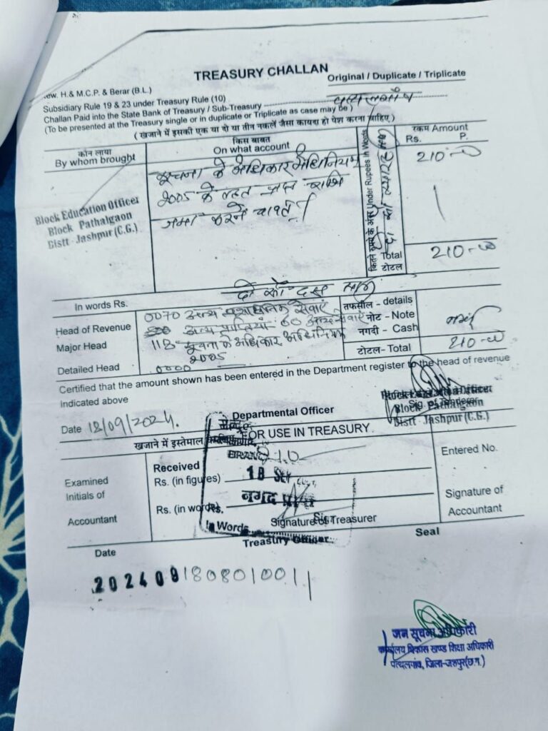 आवेदन प्राप्त होने के बाद आनन फानन में अपने कृत्यों को छुपाने के लिए आधी अधूरी जानकारी आवेदनकर्ता को देते हुए विकास खण्ड शिक्षा अधिकारी विनोद पैंकरा के द्वारा 18/09/2024 को 210रुपए का चलान जमा किया गया एवं अपने बचाव हेतु पत्र लिखकर जानकारी दी गई इतने वर्षों तक शासकीय राशि का स्वयं उपयोग करते रहे हैं जो कि गबन की ही श्रेणी में आता है।