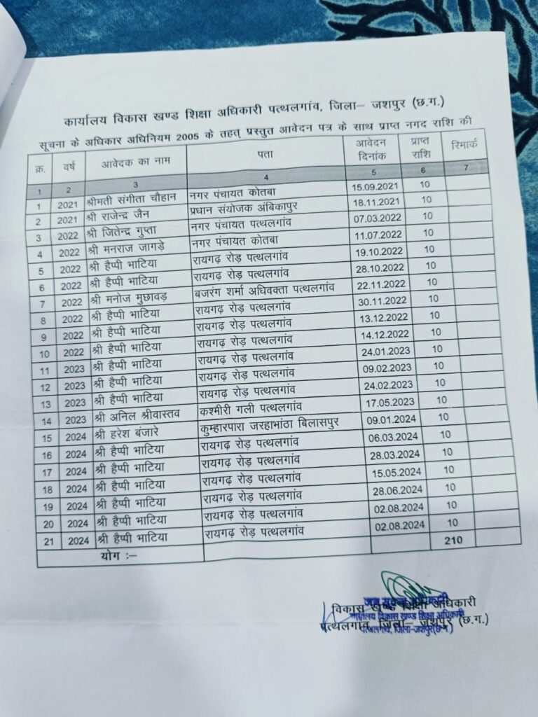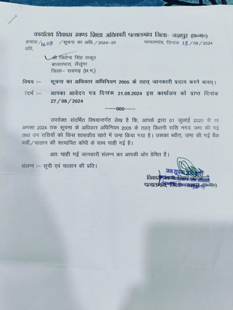 पत्थलगांव : यूं तो हमेशा सुर्खियों में रहने वाला विकास खण्ड शिक्षा अधिकारी कार्यालय पत्थलगांव के नित नए नए कारनामे सामने आते ही रहते हैं इसी कड़ी में एक और नए गबन का मामला प्रकाश में आया है जिसका खुलासा सूचना के अधिकार के तहत आवेदन देने पर आया है। विदित हो कि लैलूंगा निवासी जितेंद्र सिंह के द्वारा विकास खण्ड शिक्षा अधिकारी से दिनांक 21/08/2024 को आवेदन देकर मांग की गई थी कि विकास खण्ड कार्यालय में 01जुलाई 2020 से 15 अगस्त 2024 तक सूचना के अधिकारी आवेदन के द्वारा कितनी राशि प्राप्त हुई एवं प्राप्त राशियों को किस बैंक खाते में जमा किया गया।
