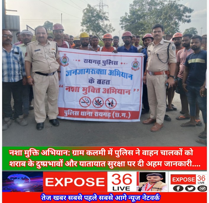 *18 अक्टूबर, रायगढ़* । पुलिस अधीक्षक श्री दिव्यांग कुमार पटेल के मार्गदर्शन में चल रहे नशा मुक्ति अभियान के तहत, आज ग्राम कलमी में पुलिस द्वारा एक जागरूकता कार्यक्रम का आयोजन किया गया। निरीक्षक रामकिंकर यादव के नेतृत्व में इस कार्यक्रम में वाहन चालकों, खलासियों, और कोयला पार्किंग यार्ड के गार्डों को शराब के नकारात्मक प्रभावों के बारे में विस्तृत जानकारी दी गई।