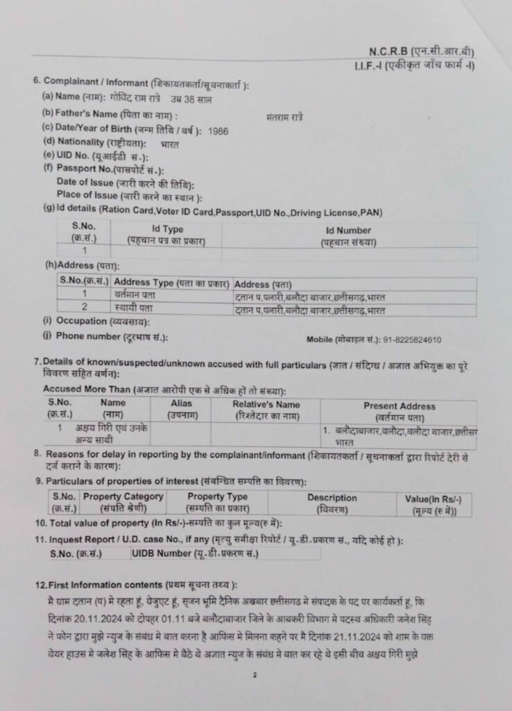 ग्राम दतान (प) पोस्ट दतान थाना पलारी जिला बलौदाबाजार-भाटापारा छ०ग० के स्थायी निवासी हैं व दैनिक अखबार सृजन भूमि छत्तीसगढ़ के संपादक हैं।बलौदाबाजार जिले के आबकारी विभाग में पदस्थ अधिकारी के सरंक्षण में चल रहा अपराधी प्रवित्ती का व्यक्ति अक्षय गिरी ने उपस्थित आबकारी विभाग के अधिकारी जलेश सिंह व अन्य पत्रकार साथीगण के समक्ष धमकी दिया कि ऑफिस से बाहर निकलोगे तब देख लेंगे। जब हम जा रहे थे तब रास्ते में शासकिय पालिटेक्नींग कालेज सकरी के सामने 8 से 9 बजे के बिच मेन रोड़ में दो अज्ञांत लडके हथियार ले कर खड़े थें जिन्होने लाठी, डण्डा, राड़, बेल्ट, से लगातार प्रहार करने लगा एवं रात्रे को टारगेट बना कर बुरी तरह से मारने लगे और जेब में रखे 32000 रुपये को शराब माफिया के डकैतों ने लुट लिया एवं मेरे साथ चल रहे अन्य प्रत्रकार पुष्पकांत मेजर, लकेश बघेल को भी बुरी तरह से मारे और किसी को बताने व पुलिस रिपोर्ट लिखाने पर जान से मारने की धमकी देने लगे।उनकी लगातार प्रहार से गोविंद बेहोश हो गया जिसको देखकर गुण्डे लोग मरा हुआ समझ कर भाग गये।