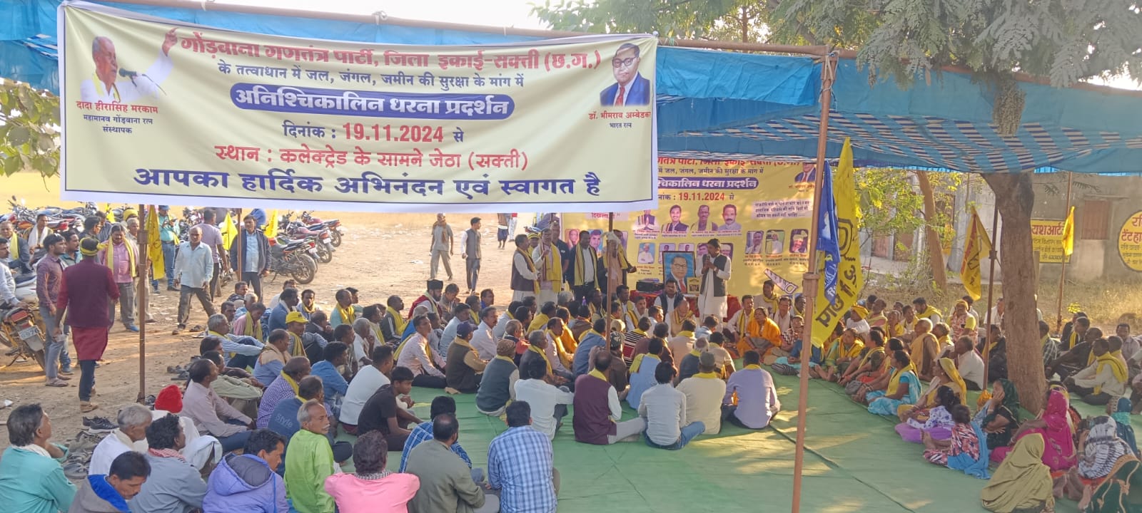 सक्ती। आदिवासी की 12 डिसमिल भूमि को गैर आदिवासी द्वारा ठगी करते हुए उपपंजीयक से सांठगांठ कर कलेक्टर के अनुमति बिना खरीदी करने का आरोप लगाते हुए गोंडवाना गणतंत्र पार्टी के जिला पदाधिकारियों ने 19 नवंबर से अनिश्चितकालीन धरना पर कलेक्टर कार्यालय के सामने टेंट लगाकर बैठे गए है। गोंगपा के राष्ट्रीय अध्यक्ष तुलेश्वर सिंह मरकाम भी धरना स्थल पहुंचकर प्रशासन पर आरोप लगाते हुए जमकर बरसे।