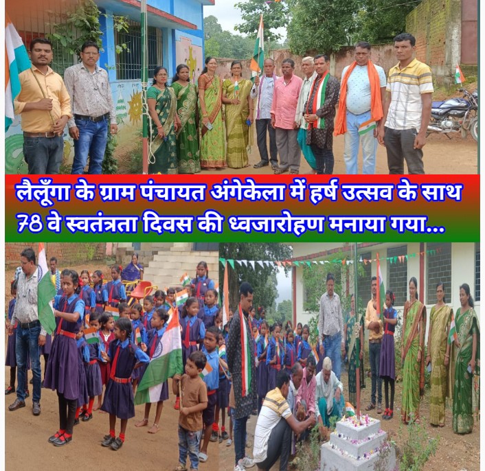लैलूंगा/ शहर के साथ ग्रामीण क्षेत्र ग्राम पंचायत अंगेकेला में भी 15अगस्त स्वतंत्रता दिवस का राष्ट्रीय पर्व बड़े ही हर्ष और उल्लास के साथ मनाया गया। ग्रामीण क्षेत्र के तमाम स्कूलों में झंडा फहराकर सलामी दी गई। विकासखण्ड में सभी क्षेत्रों एवं गांवों के पंचायत भवनों, स्कूलों के प्रांगण में स्कूल के प्रबंधक द्वारा ध्वज फहराया गया।इसी क्रम में