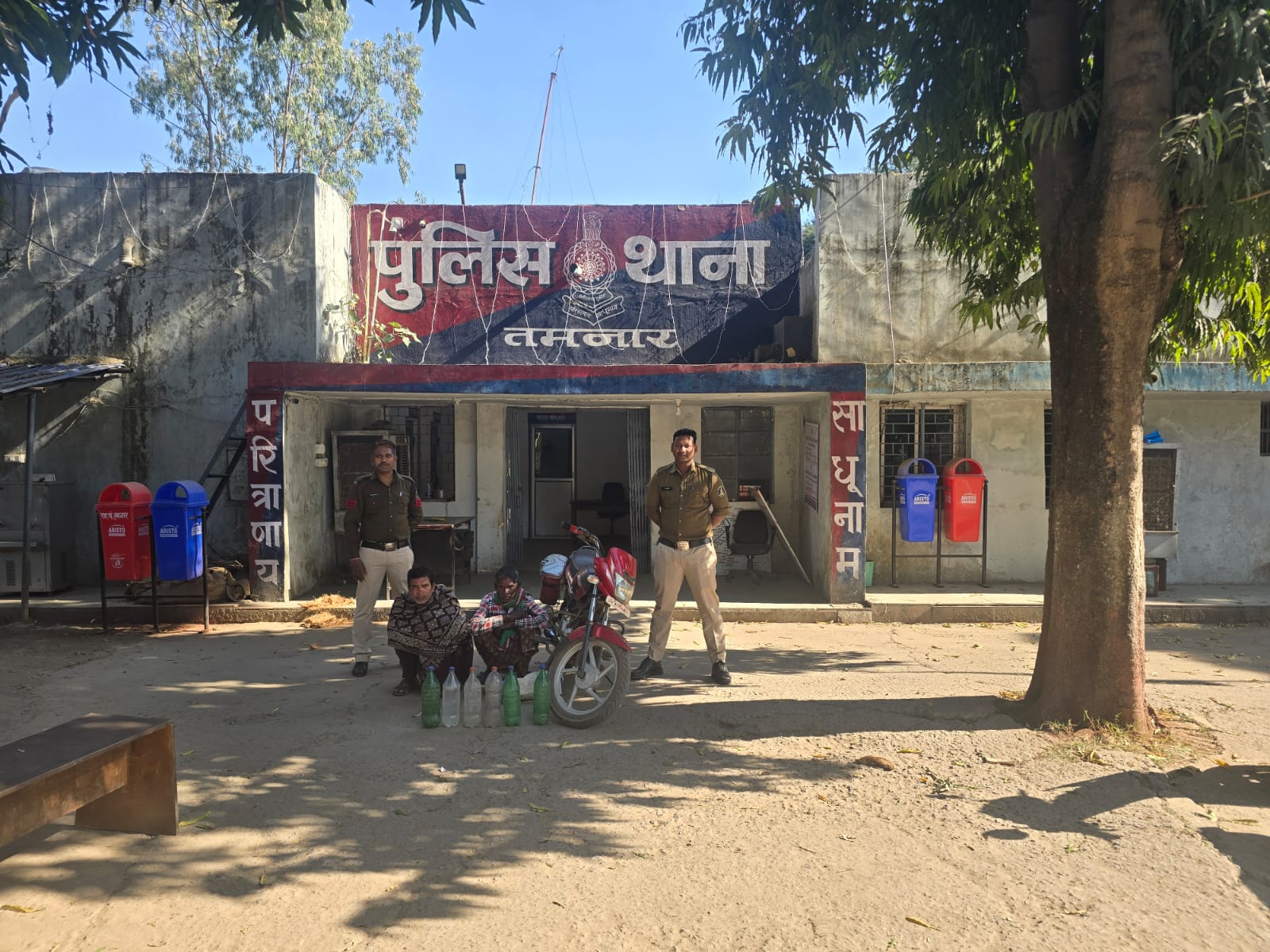 *तमनार थाना क्षेत्र में* सहायक उपनिरीक्षक सुरूति लाल सिदार और प्रधान आरक्षक देव प्रसाद राठिया के नेतृत्व में पुलिस ने लमडांड मेन रोड पर नाकेबंदी कर शराब तस्करी करते दो व्यक्तियों को गिरफ्तार किया। आरोपी 01. कार्तिक राम बंजारा पिता S/O स्व शहनी राम बंजारा उम्र 55 सा लमडांड (खुरुसलेंगा) थाना तमनार 02.तेजराम सिदार ऊर्फ पुजेरी S/O स्व नकुल सिदार उम्र 59 वर्ष सा गौरबहरी थाना तमनार के पास से 12 लीटर कच्ची महुआ शराब और एक बजाज प्लेटिना मोटरसाइकिल जप्त की गई। दोनों आरोपियों पर धारा 34(2) और 59(क) आबकारी एक्ट के तहत कार्रवाई की गई।