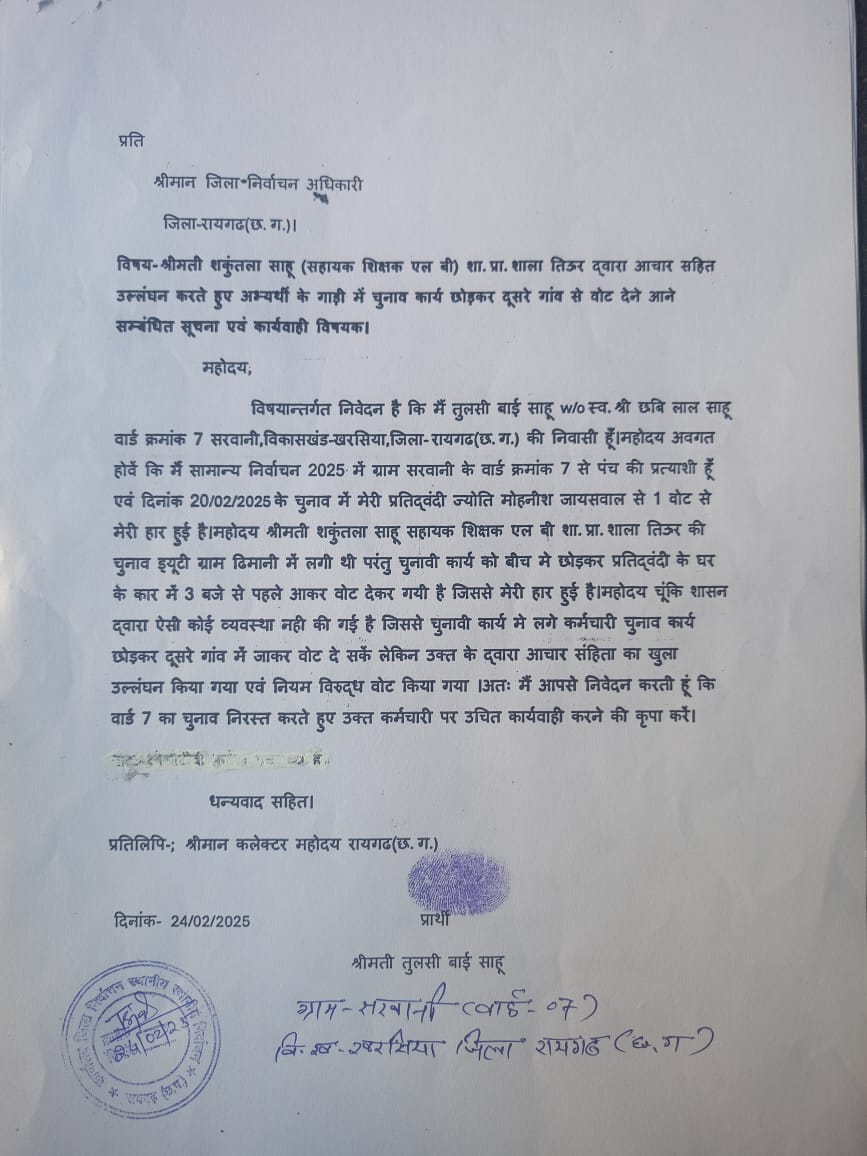खरसिया ग्राम सरवानी की पांच प्रत्याशी रही तुलसी बाई साहू ने सहायक शिक्षक शकुंतला साहू के विरुद्ध शिकायत रिटर्निंग ऑफिसर एवं जिला निर्वाचन अधिकारी से की गई है क्या है पूरा मामला तुलसी बाई साहू का कहना है कि सामान्य निर्वाचन 2025 में ग्राम सरवानी के वार्ड क्रमांक 7 से पंच की प्रत्याशी थी एवं दिनांक 20/02/2025 के चुनाव में मेरी प्रतिद्वंदी ज्योति मोहनीश जायसवाल से 1 वोट से मेरी हार हुई है।शकुंतला साहू सहायक शिक्षक एल बी शा. प्रा. शाला तिऊर की चुनाव ड्यूटी ग्राम ढिमानी में लगी थी परंतु चुनावी कार्य को बीच मे छोड़कर प्रतिद्वंदी के घर के कार में 3 बजे से पहले आकर वोट देकर गयी है जिससे मेरी हार हुई है। चूंकि शासन द्वारा ऐसी कोई व्यवस्था नहीं की गई है जिससे चुनावी कार्य मे लगे कर्मचारी चुनाव कार्य छोड़कर दूसरे गांव में जाकर वोट दे सकें लेकिन उक्त के द्वारा आचार संहिता का खुला उल्लंघन किया गया एवं नियम विरुद्ध वोट किया गया। वार्ड 7 का चुनाव निरस्त करे हुए उक्त कर्मचारी पर उचित कार्यवाही करे ताकि भविष्य में किसी प्रकार की कोई चुनाव एवं आचार संहिता का कोई उल्लंघन न करें अगर इसी तरह की अधिकारियों कर्मचारियों आचार संहिता और चुनाव ड्यूटी का उल्लंघन करें तो आम जानते पर क्या संदेश जाएगा।