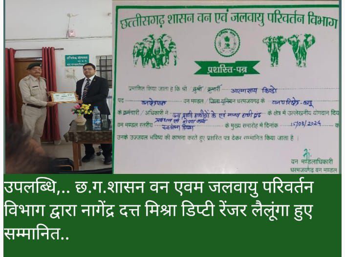 को छत्तीसगढ़ शासन वन एवं जलवायु परिवर्तन विभाग द्वारा विभागीय विभिन्न क्षेत्रों जिसमे वन्य प्राणी हाथियों के प्रबंधन व रोपण कार्य एवं मानव हाथी द्वंद के क्षेत्र में उल्लेखनीय योगदान देने हेतु प्रशस्ति पत्र देकर सम्मानित किया गया है।इस अवसर पर धरमजयगढ़ वन मंडल के सभी विभागीय अधिकारी कर्मचारी ने