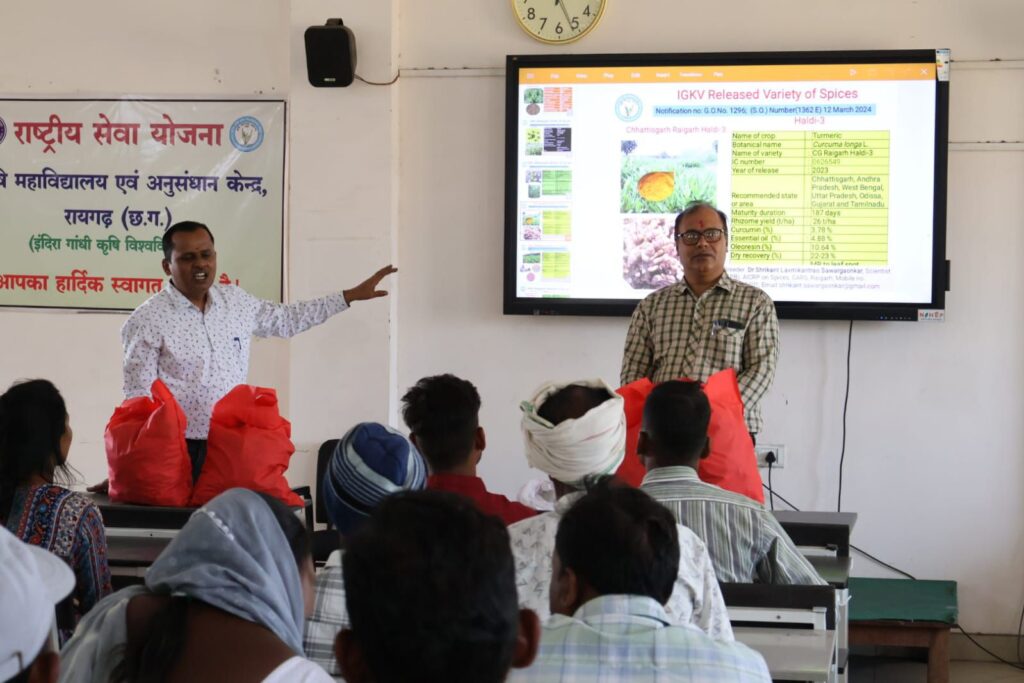 कार्यशाला में कृषि महाविद्यालय एवं अनुसंधान केंद्र के अधिष्ठाता एवं अखिल भारतीय मसाला अनुसंधान परियोजना के प्रमुख अन्वेषक डॉक्टर ए.के.सिंह के द्वारा हल्दी में आने वाले प्रमुख रोगों एवं उनको दूर करने के उपाय के बारे में विस्तार पूर्वक बताया गया। उन्होंने हल्दी के कुशल उत्पादन के लिए रोगों से बचने के लिए पूर्व नियोजित तरीके के बारे में भी कृषकों को अवगत कराया। कार्यक्रम में कृषि महाविद्यालय एवं अनुसंधान केंद्र के अनुवांशिकी एवं पादप प्रजनन के वैज्ञानिक डॉक्टर श्रीकांत सावरगांवकर ने कृषकों को संबोधित करते हुए बताया कि छत्तीसगढ़ हल्दी-2 एवं छत्तीसगढ़ हल्दी-3 बीज के उत्पादन में किस प्रकार बढ़ोतरी करके उनसे ज्यादा से ज्यादा लाभ अर्जित किया जा सकता है। उन्होंने कृषकों को बताया कि अगर सही तरीके से तकनीकी रूप से उत्पादन पर ध्यान दिया जाए तो कम लागत में ज़्यादा उत्पादन लिया जा सकता है। एक दिवसीय प्रशिक्षण के दौरान डॉ.संदीप कुमार पैकरा, महेंद्र साहू एवं महाविद्यालय के सभी अधिकारी एवं कर्मचारीगण के उपस्थिति में कार्यक्रम का सफलतापूर्वक आयोजन किया गया।