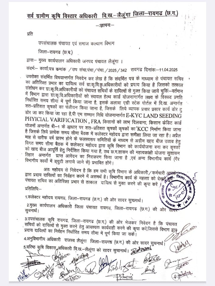 लैलूंगा।लैलूंगा विकासखंड के सर्व ग्रामीण कृषि विस्तार अधिकारियों ने पंचायत सचिवों का अतिरिक्त प्रभार लेने से स्पष्ट इंकार करते हुए इसे तुरंत निरस्त करने की मांग की है। उपसंचालक पंचायत एवं समाज कल्याण विभाग को भेजे गए ज्ञापन में अधिकारियों ने बताया कि उन्हें कृषि विभाग द्वारा विभिन्न महत्वपूर्ण योजनाओं का संचालन सौंपा गया है, जिनमें समयबद्ध रूप से लक्ष्य प्राप्त करना आवश्यक है।