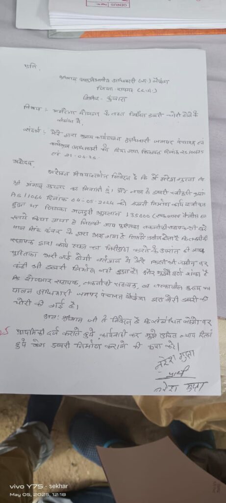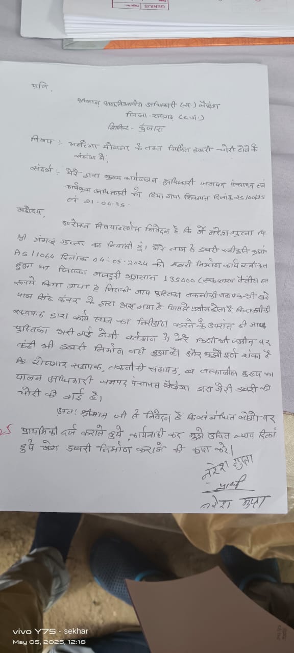लैलूंगा, रायगढ़।नरेगा योजना के अंतर्गत डबरी निर्माण में एक बड़ा फर्जीवाड़ा सामने आया है। ग्राम कुंजारा निवासी नरेश गुप्ता ने सुशासन शिविर कुंजारा मे अनुविभागीय अधिकारी (रा.) लैलूंगा को शिकायत पत्र सौंपकर आरोप लगाया है कि उनके नाम से स्वीकृत डबरी का निर्माण कार्य सिर्फ कागजों में ही हुआ है, जबकि वास्तविक रूप से उनकी किसी भी जमीन पर डबरी नहीं बनाई गई है।