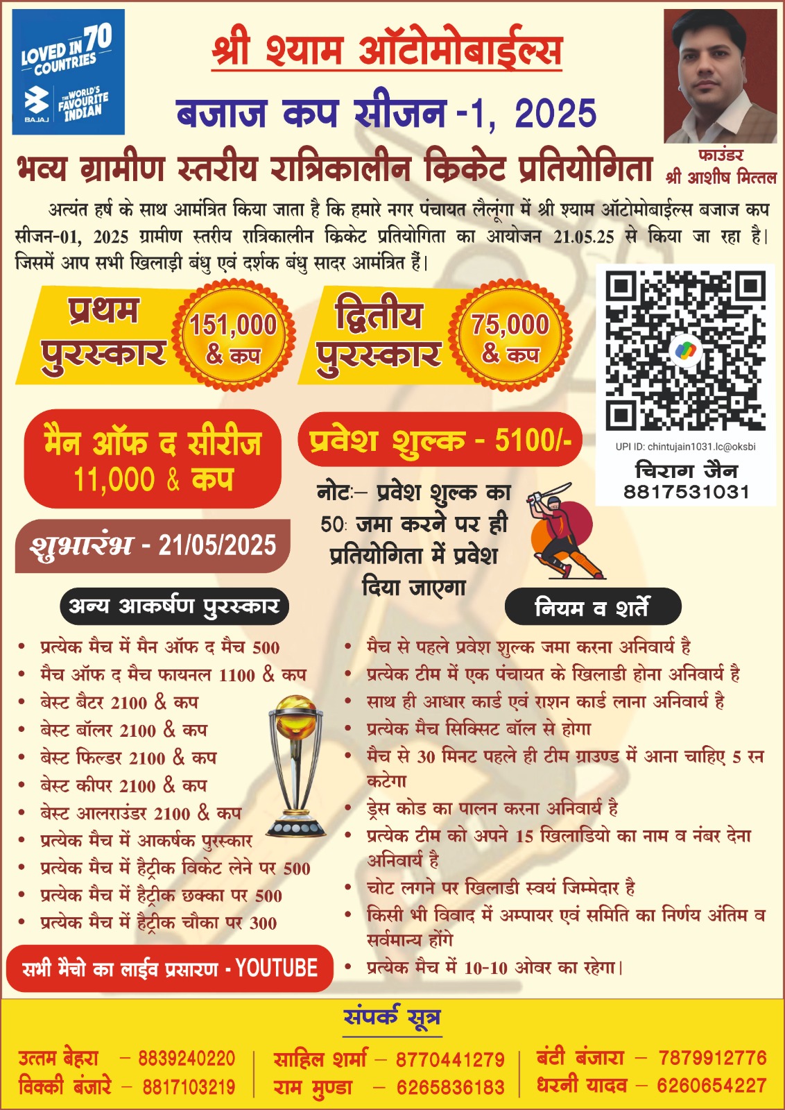 इस आयोजन का उद्देश्य केवल क्रिकेट नहीं, बल्कि युवाओं को एकजुट करना और उन्हें सही दिशा में प्रेरित करना भी है। जब युवा मैदान में उतरते हैं, तो वे केवल रन नहीं बनाते, वे अनुशासन, आत्मविश्वास और टीमवर्क की सीख भी पाते हैं। श्री श्याम ऑटोमोबाइल द्वारा आयोजित यह प्रतियोगिता एक शानदार उदाहरण है कि निजी संस्थाएं कैसे समाज और युवा विकास में योगदान दे सकती हैं।