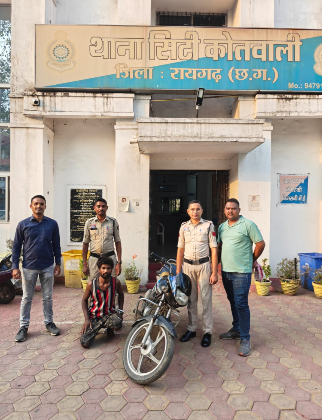 इस संबंध में कोतवाली पुलिस ने अज्ञात आरोपी के खिलाफ अपराध क्रमांक 151/2025 धारा 303(2) बीएनएस के तहत मामला पंजीबद्ध कर जांच शुरू की थी। मुखबिर से मिली सूचना पर संदेही बलराम साहू को गिरफ्तार कर उसके कब्जे से चोरी की बाइक बरामद की गई। आरोपी बलराम साहू, पिता स्व. जगमोहन साहू, उम्र 28 वर्ष, निवासी सोनुमुड़ा, काली मंदिर के पास, वार्ड क्रमांक 42, थाना जूटमिल, रायगढ़ के विरुद्ध पहले से भी चोरी और मारपीट के मामले दर्ज हैं।