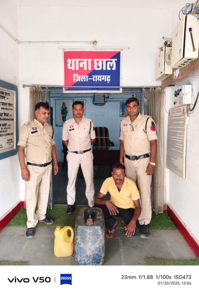 *20 जुलाई 2025, रायगढ़*- पुलिस अधीक्षक श्री दिव्यांग पटेल के निर्देश पर जिले में अवैध शराब कारोबार पर लगातार शिकंजा कसा जा रहा है। इसी कड़ी में छाल थाना प्रभारी निरीक्षक त्रिनाथ त्रिपाठी के नेतृत्व में पुलिस टीम ने रविवार 20 जुलाई को ग्राम बरभौना स्थित मांड नदी किनारे दबिश देकर अवैध रूप से महुआ शराब बेचने की तैयारी कर रहे एक आरोपी को रंगे हाथों गिरफ्तार किया है। पुलिस ने आरोपी के पास से 30 लीटर महुआ शराब जब्त करते हुए आबकारी एक्ट की धाराओं के तहत कार्रवाई की है।