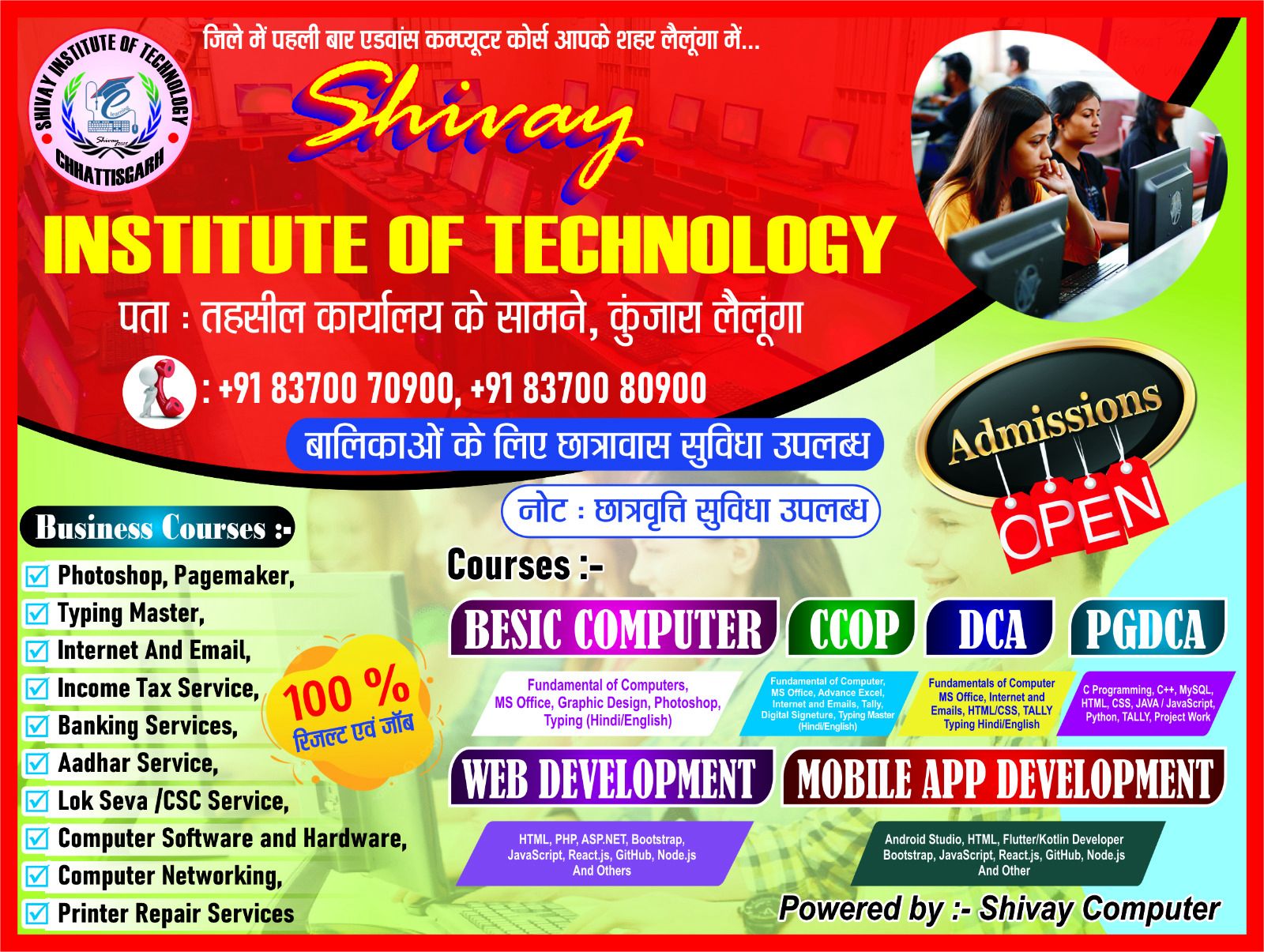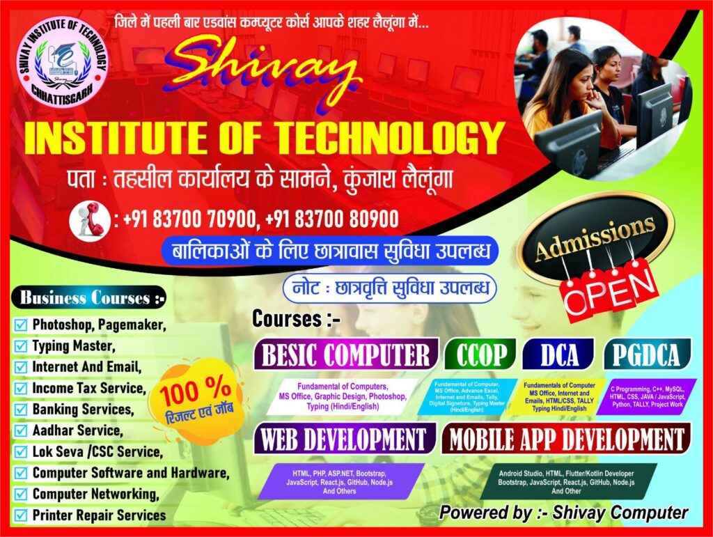 लैलूंगा/कुंजारा, छत्तीसगढ़ के लैलूंगा क्षेत्रवासियों के लिए तकनीकी शिक्षा के क्षेत्र में एक सुखद समाचार सामने आया है। अब जिले में पहली बार एडवांस कंप्यूटर कोर्सेस आपके अपने शहर लैलूंगा में उपलब्ध हैं। “शिव इंस्टीट्यूट ऑफ टेक्नोलॉजी” ने अपनी शाखा तहसील कार्यालय के सामने, कुंजारा लैलूंगा में प्रारंभ की है, जो युवाओं के लिए रोज़गारपरक और व्यावसायिक शिक्षा के नए अवसर लेकर आया है।