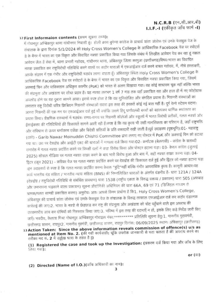 होली क्रॉस विमेन्स कॉलेज अंबिकापुर में विवादित नक्शे पर प्राचार्या शांता जोसफ पर एफआईआर – प्राचार्य के रहते कैसे होगी निष्पक्ष जाँच?