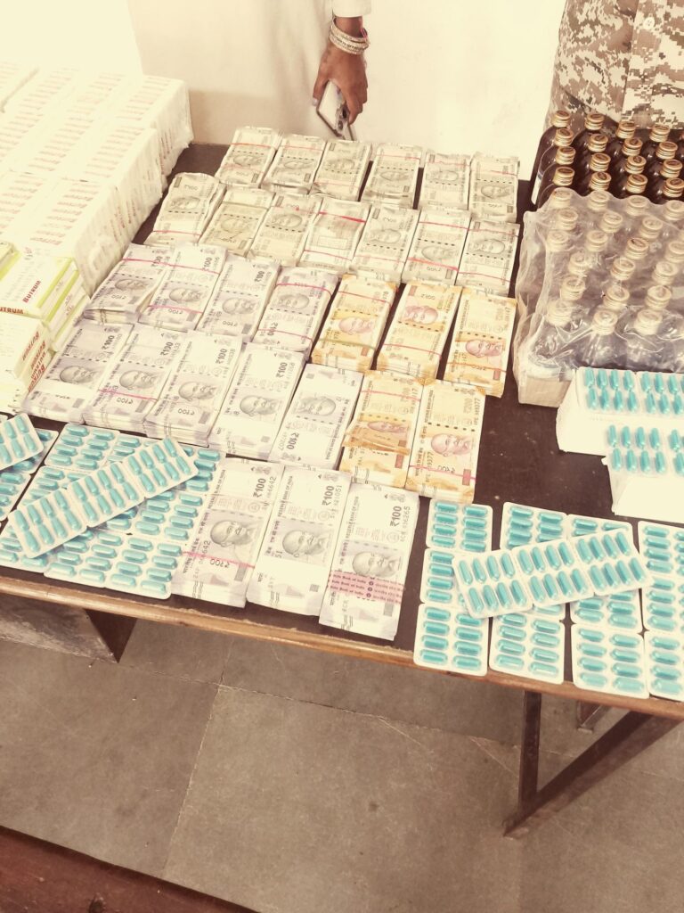 प्रतिबंधित नशीली कफ सिरप, दर्द निवारक गोलियों, इंजेक्शन का जखीरा और नगदी समेत 9 लाख से अधिक की बरामदगी