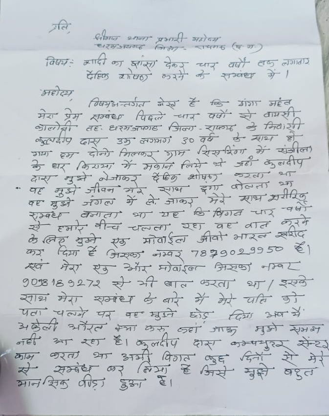 एक युवक ने शादी शुदा महिला को अपने प्रेम जाल में फंसाने का मामला सामने आया है, महिला अब न्याय के लिए दर-दर की ठोकर खा रही है, महिला थक हारकर न्याय की आस लेकर पुलिस के पास पहुंची है। पीडि़त महिला ने अपने धोखेबाज प्रेमी पर आरोप लगाया है कि पहले तो महिला को बड़े-बड़े सपना दिखाकर प्रेम जाल में फंसाया उसके बाद महिला का चार साल तक दैहिक शोषण किया अब मन भर जाने के बाद महिला को छोड़ दिया। महिला ने प्रेस में आकर जानकारी दी है कि बायसी कॉलोनी निवासी जो धरमजयगढ़ में कम्प्यूटर सेंटर चलता है कुलदीप दास जीवन भर साथ दूंगा बोलता था और मुझे जंगल में ले जाकर मेरे साथ शरीरिक संबंध बनाता था। बाद में हम दोनों मिलकर सिसरिंगा में संजीला का घर किराये में लिये थे कुलदीप सिंसरिंगा किराये के घर में मेरे साथ शारीरिक संबंध बनाने लगा। इसकी जानकारी मेरे पति को होने के बाद मेरा पति मुझे छोड़ दिया और कुलदीप दास भी मुझे छोड़ दिया अब मेरे पास मरने के अलावा और कुछ नहीं है। पीडि़त महिला ने पुलिस थाना में दिये आवेदन में उल्लेख किया है कि कुलदीप दास बात करने के लिए एक जीओ भारत का मोबाईल भी दिया था जिसका नंबर है 7879029950 और इसके अलावा महिला का दूसरा एक और मोबाईल नंबर 9098189272 में कुलदीप फोनकर कर के बाद करता था। महिला ने बाताई की मुझे अब बहुत मानसिक पीड़ा झेलना पड़ रहा है अगर मुझे न्याय नहीं मिलता है तो मेरे पर मरने के अलावा और कोई चारा नहीं है, पीडि़त महिला ने अपने प्रेमी युवक के खिलाफ पुलिस थाना में आवेदन देकर न्याय की गुहार लगाई है।