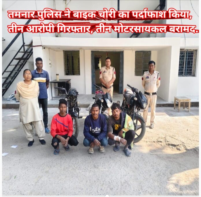 तमनार पुलिस ने बाइक चोरी का पर्दाफाश किया, तीन आरोपी गिरफ्तार, तीन मोटरसायकल बरामद…