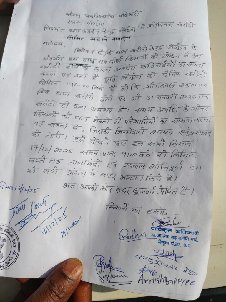 किसानों ने अनुविभागीय अधिकारी राजस्व, लैलूंगा को ज्ञापन सौंपते हुए स्पष्ट किया है कि यदि प्रतिदिन कम से कम 2500 क्विंटल धान की खरीदी नहीं की गई, तो निर्धारित समय-सीमा 31 जनवरी 2026 तक किसानों का धान बिक पाना असंभव है। इससे किसानों को भारी आर्थिक नुकसान उठाना पड़ सकता है।
