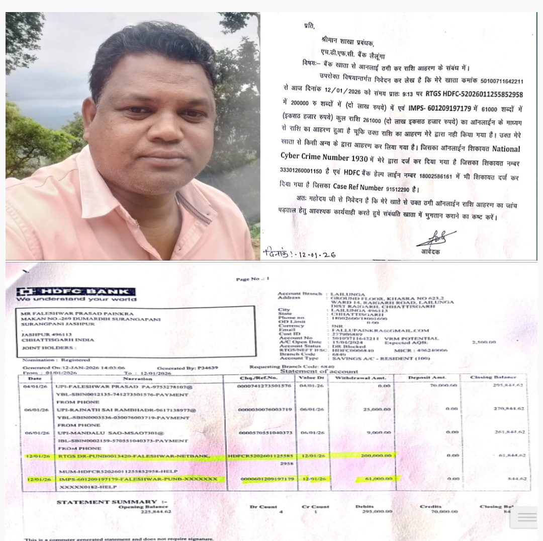 डिजिटल इंडिया के दौर में जहां एक ओर ऑनलाइन बैंकिंग ने जीवन को आसान बनाया है, वहीं दूसरी ओर साइबर अपराधियों ने आम नागरिकों की नींद उड़ा रखी है। ऐसा ही एक दिल दहला देने वाला और चौंकाने वाला मामला थाना लैलूंगा क्षेत्र से सामने आया है, जहां HDFC बैंक शाखा लैलूंगा के एक खाताधारक फ्लेस्वर पैंकरा वरिष्ठ कृषि विस्तार अधिकारी लैलूंगा के खाते से मात्र कुछ ही मिनटों में 2 लाख 61 हजार रुपये की ऑनलाइन ठगी कर ली गई। इस घटना के बाद पीड़ित ही नहीं, बल्कि पूरे क्षेत्र में दहशत और आक्रोश का माहौल है।