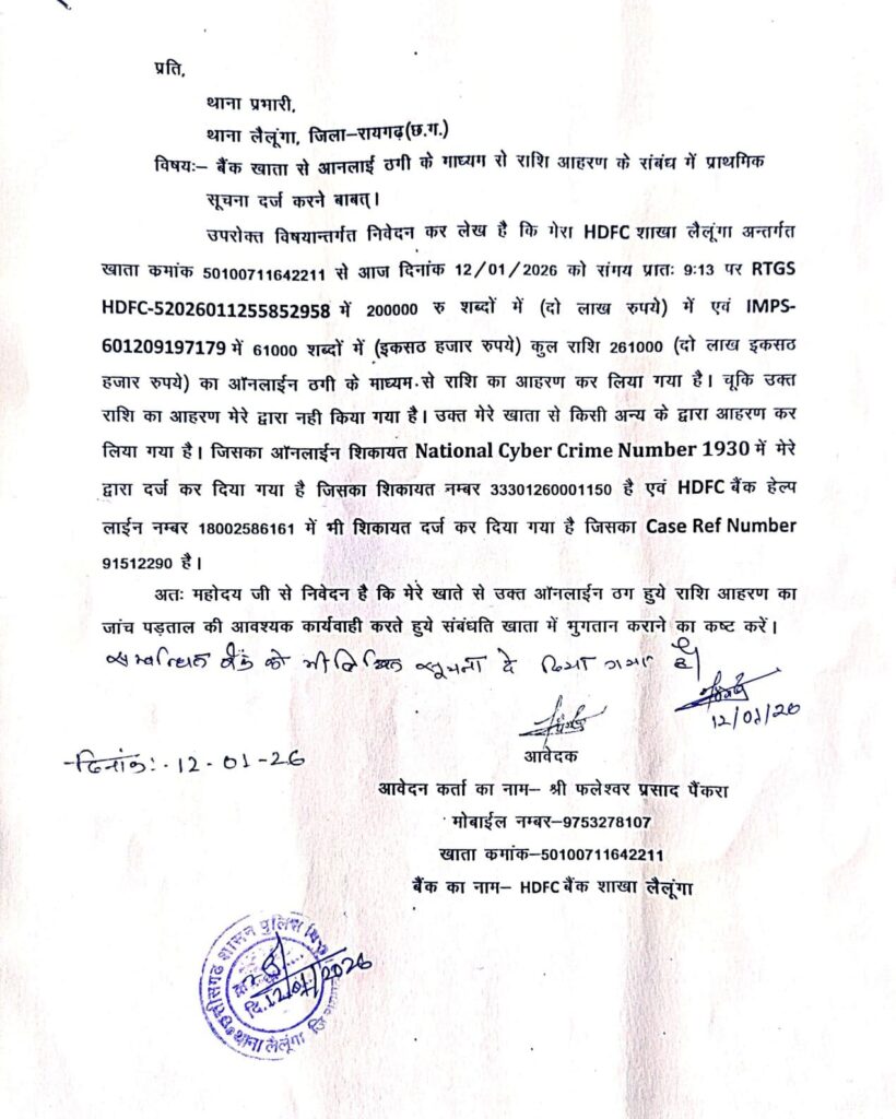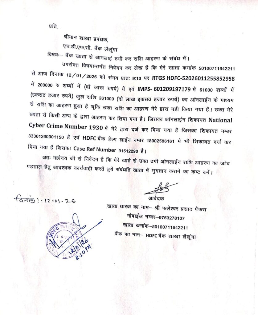 मामले को लेकर पीड़ित ने थाना प्रभारी, थाना लैलूंगा, जिला रायगढ़ को लिखित आवेदन देकर प्राथमिक सूचना दर्ज कर उचित जांच एवं ठगी गई राशि की वापसी की मांग की है। आवेदन में स्पष्ट रूप से उल्लेख किया गया है कि यह एक सुनियोजित ऑनलाइन ठगी है, जिसमें किसी अज्ञात व्यक्ति या गिरोह द्वारा बैंकिंग सिस्टम का दुरुपयोग किया गया है।