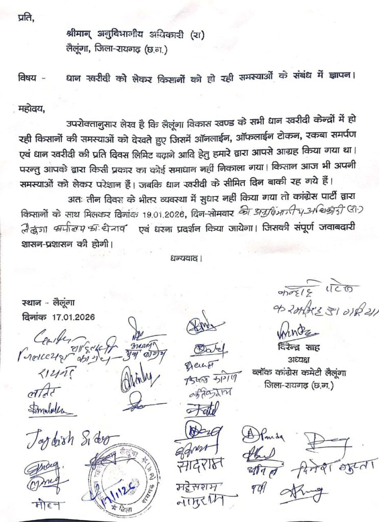 लैलूंगा , लैलूंगा विकासखण्ड के धान खरीदी केन्द्रों में व्याप्त गंभीर अव्यवस्थाओं को लेकर अब किसानों का सब्र जवाब देने लगा है। लगातार समस्याओं के बावजूद प्रशासनिक स्तर पर कोई ठोस समाधान नहीं निकलने से आक्रोश बढ़ता जा रहा है। इसी कड़ी में कांग्रेस पार्टी ने किसानों के समर्थन में मोर्चा खोलते हुए अनुविभागीय अधिकारी (राजस्व) लैलूंगा को ज्ञापन सौंपकर तीन दिवस का अल्टीमेटम दिया है।
