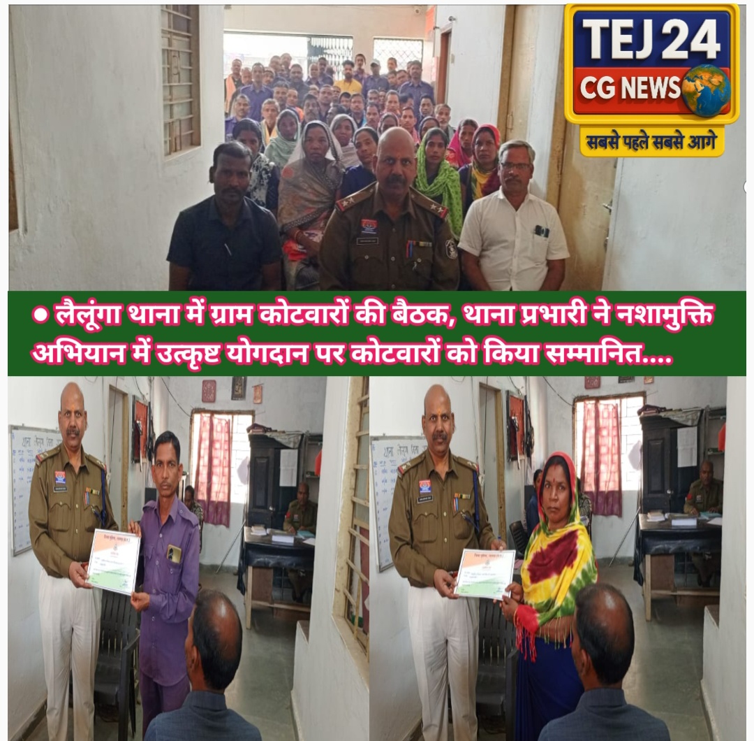 ● लैलूंगा थाना में ग्राम कोटवारों की बैठक, थाना प्रभारी ने नशामुक्ति अभियान में उत्कृष्ट योगदान पर कोटवारों को किया सम्मानित….
