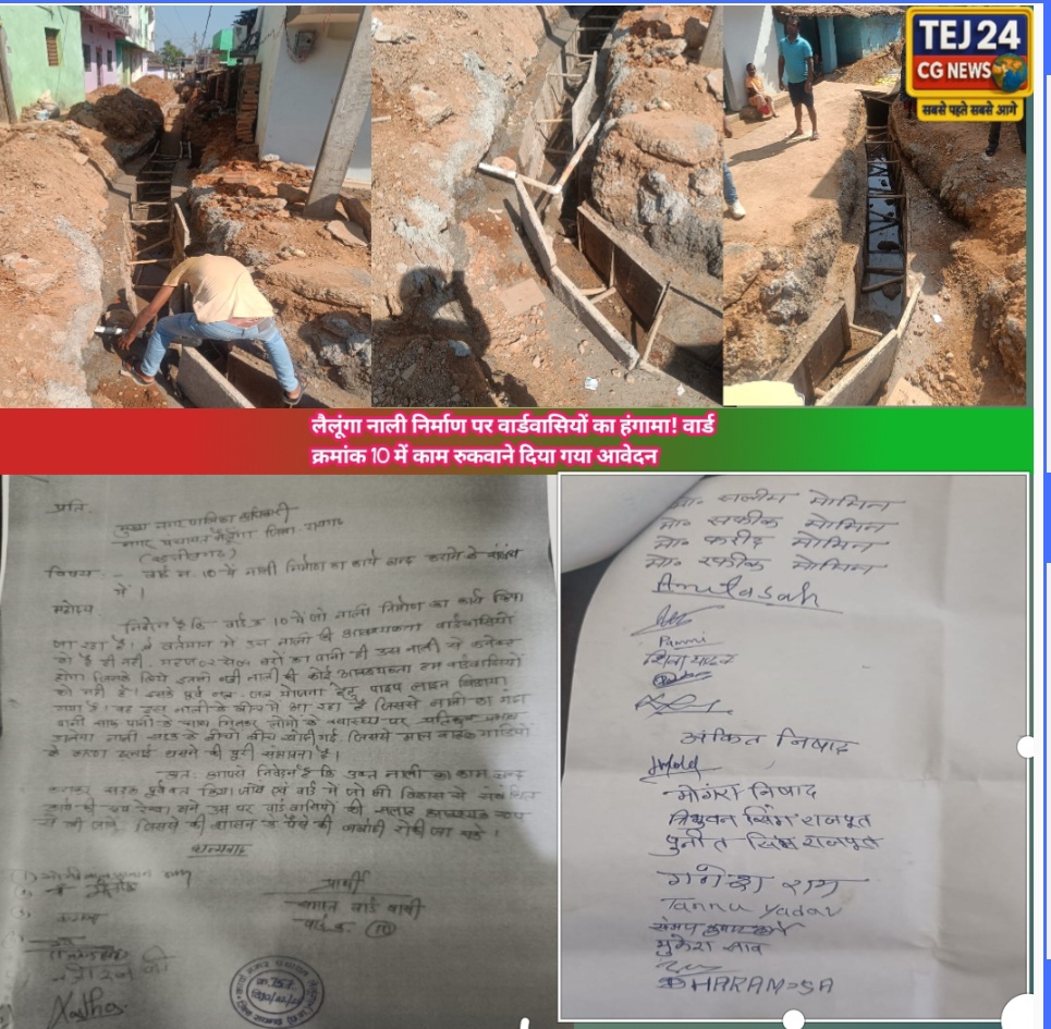 लैलूंगा नगर पंचायत के वार्ड क्रमांक 10 में चल रहे नाली निर्माण कार्य को लेकर वार्डवासियों में भारी नाराज़गी देखी जा रही है। आक्रोशित नागरिकों ने मुख्य नगर पालिका अधिकारी, नगर पंचायत लैलूंगा (जिला रायगढ़) को आवेदन सौंपकर तत्काल कार्य बंद कराने की मांग की है। वार्ड में इस मुद्दे को लेकर माहौल गर्म हो गया है और लोग इसे शासन के पैसे की बर्बादी बता रहे हैं।