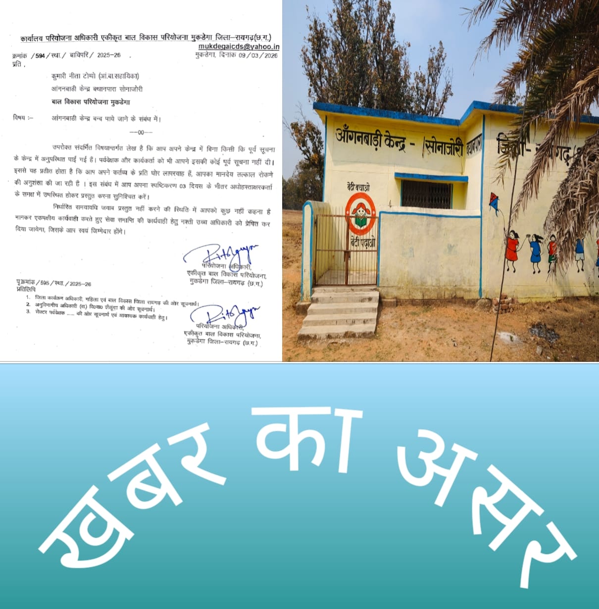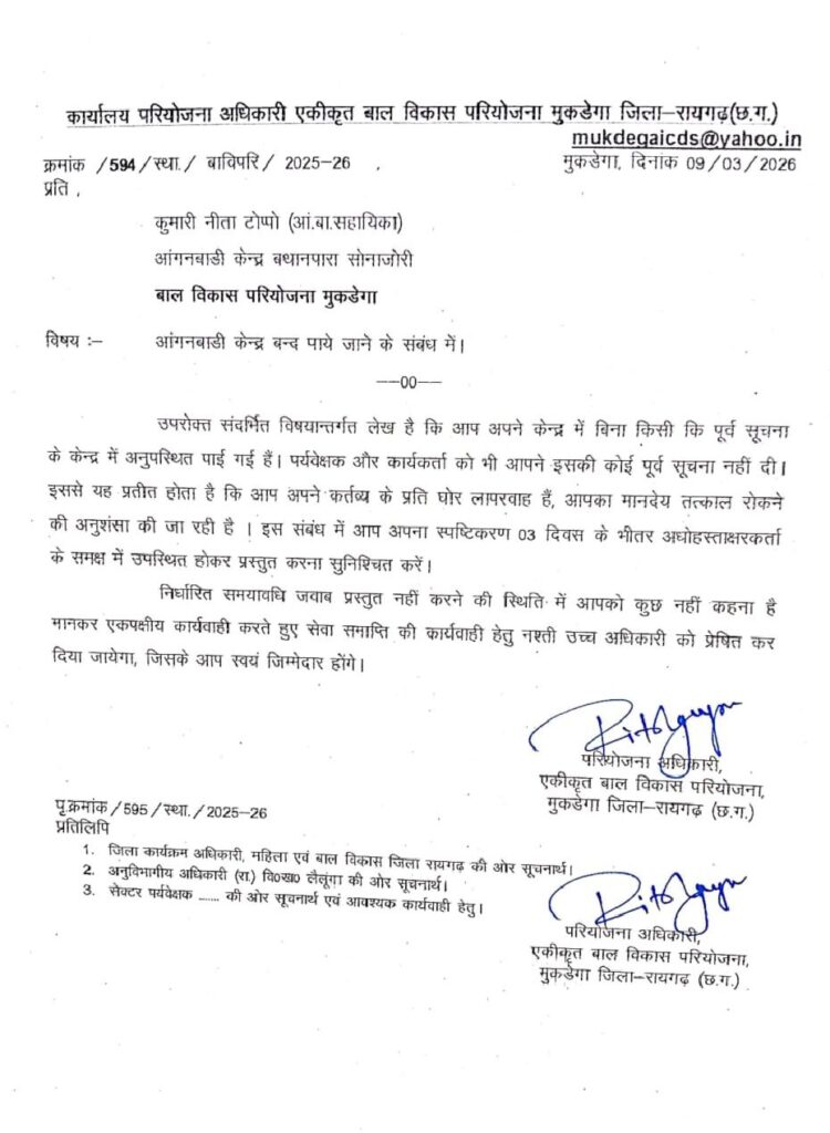 मामला मीडिया में सामने आने के बाद कार्यालय परियोजना अधिकारी, एकीकृत बाल विकास परियोजना मुकडेगा, जिला रायगढ़ ने तत्काल कार्रवाई करते हुए आंगनबाड़ी सहायिका कुमारी नीता टोप्पो को कारण बताओ नोटिस जारी किया है। नोटिस में स्पष्ट उल्लेख किया गया है कि सहायिका अपने केंद्र में बिना किसी पूर्व सूचना के अनुपस्थित पाई गईं, जिसकी जानकारी उन्होंने न तो पर्यवेक्षक को दी और न ही कार्यकर्ता को।