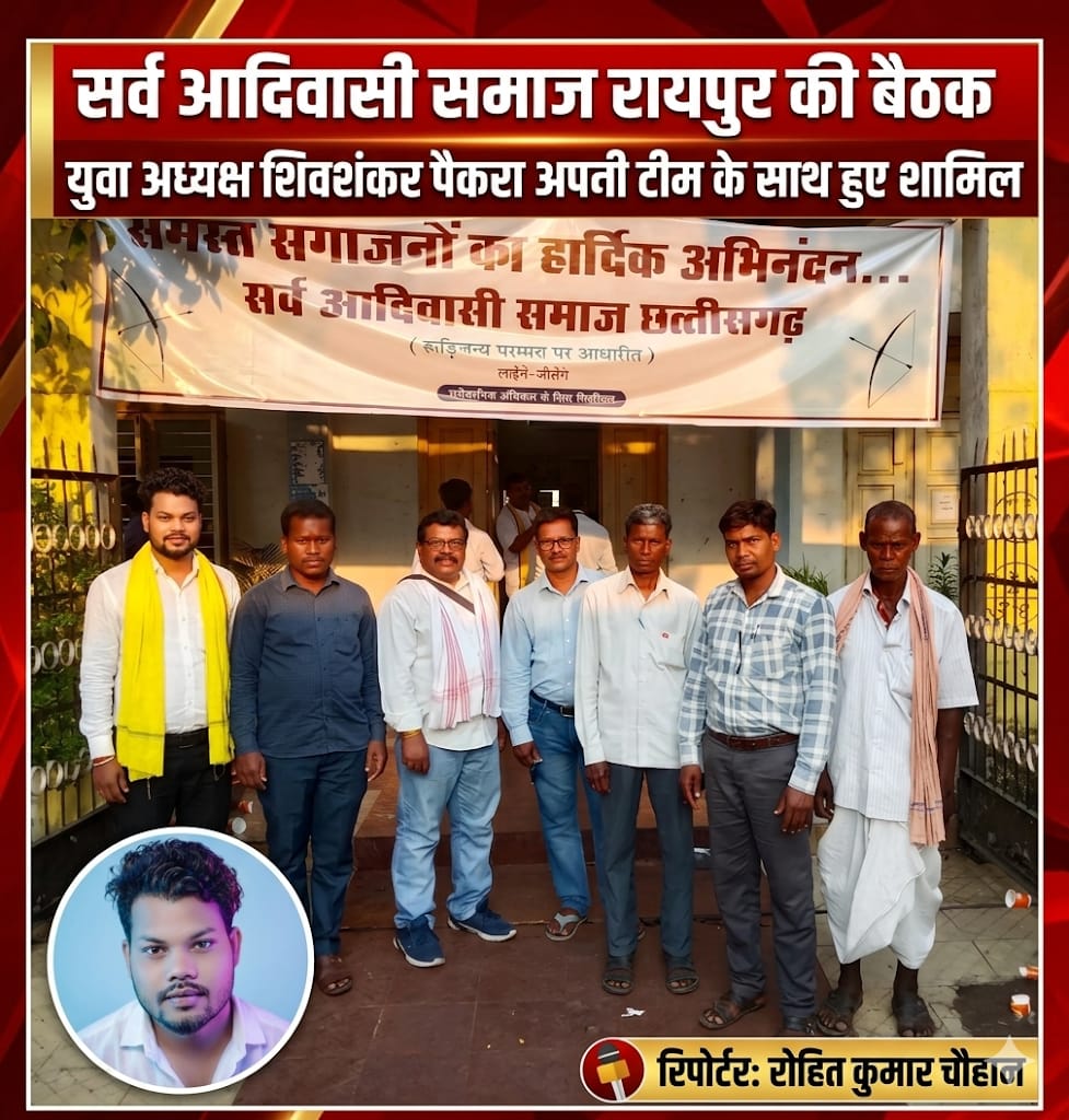 लैलूंगा –छत्तीसगढ़ सर्व आदिवासी समाज की प्रदेश स्तरीय बैठक रविवार को रायपुर के कंवर भवन में आयोजित किया गया। बैठक में सर्व आदिवासी समाज लैलूंगा ब्लॉक के युवा प्रभाग के अध्यक्ष शिवशंकर पैकरा अपनी टीम के साथ बैठक में शामिल हुए।रायपुर में आयोजित बैठक में छत्तीसगढ़ के 42 आदिवासी समाज के प्रमुख उपस्थित रहे साथ ही बैठक में देश के झारखंड, उड़ीसा पश्चिम बंगाल मध्य प्रदेश आदि प्रदेशों से समाज प्रमुख उपस्थित रहे। बैठक का प्रमुख विषय राष्ट्रीय स्तर पर प्रस्तावित आदिवासियों के लिए आगामी जनगणना में आदिवासी धर्म कोड लिखने के लिए व्यापक प्रचार प्रसार, आगामी विधानसभा चुनाव एवं लोकसभा के परिसीमन के संदर्भ में चर्चा के साथ संगठनात्मक चर्चा की गई। बैठक में युवा प्रभाव के अध्यक्ष शिवशंकर पैकरा के उपाध्यक्ष सहनी सिदार, मुरलीधर सिदार, धनीराम सिदार राधे राम सिदार बोलल कुमार शामिल हुए।