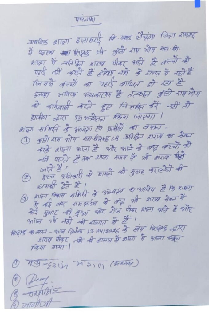 ग्रामीणों, पालकों एवं शाला प्रबंधन समिति के सदस्यों का आरोप है कि संबंधित शिक्षक अक्सर नशे की हालत में स्कूल पहुंचते हैं। कई बार समझाइश देने के बावजूद उनके व्यवहार में कोई सुधार नहीं हुआ है, जिससे स्थानीय लोगों में भारी नाराजगी व्याप्त है।