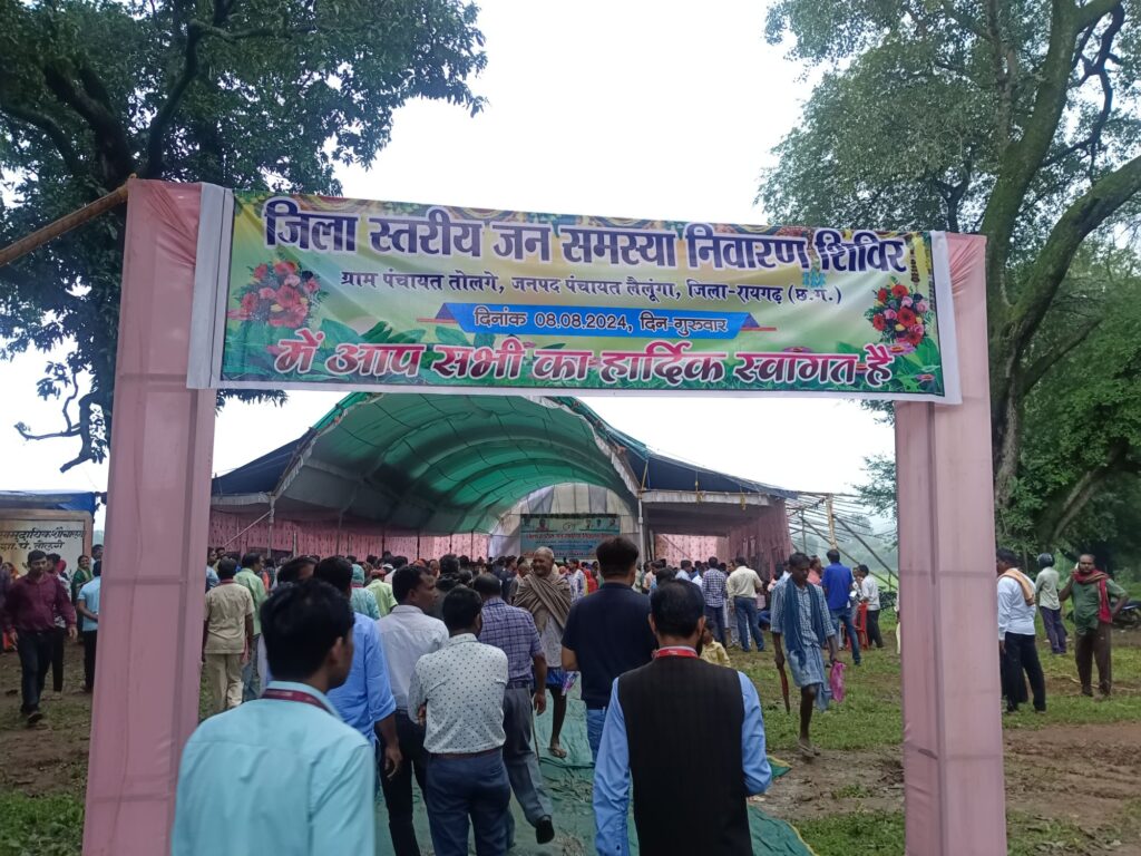 लैलूंगा/, रायगढ़ कलेक्टर कार्तिकेया गोयल के निर्देशन में रायगढ़ जिले में ग्रामीणजनों की आवश्यकताओं, शिकायतों एवं समस्याओं के त्वरित निराकरण हेतु जनसमस्या निवारण शिविरों का आयोजन विकासखण्ड लैलूंगा के ग्राम तोलगे में आयोजन विशाल जनसमस्या निवारण शिविर का आयोजन किया गया। जिसमे लैलूंगा विधायक श्रीमति विद्यावती सिदार , जिला पंचायत सीईओ राजस्व अधिकारी,जनपद सीईओ एस डी ओ पी धरमजयगढ़ सहित आला अधिकारी एवम कर्मचारियो और जनप्रतिनिधियों की उपस्थिति में आयोजन किया गया। जिसमें लगभग 25 ग्राम पंचायतों के ग्रामीणों ने अपनी मांगों और शिकायत लेके पहुँचे।