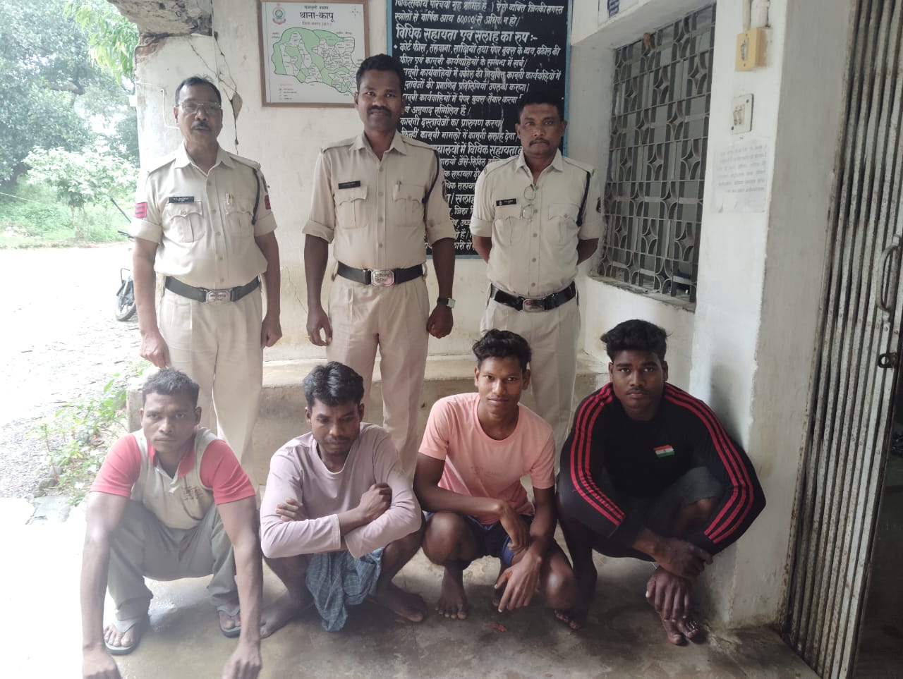 घटना की जानकारी मिलते ही थाना प्रभारी कापू निरीक्षक नारायण सिंह मरकाम ने अपनी टीम के साथ त्वरित कार्रवाई करते हुए घटनास्थल का निरीक्षण किया। मौके पर पंचनामा तैयार कर शव को पोस्टमॉर्टम के लिए भेजा गया। थाना कापू में अपराध क्रमांक 111/2024 धारा 105, 238, 3(5) बीएनएस के तहत मामला दर्ज किया गया। चार आरोपियों- रामनारायण राठिया (25 वर्ष), चनेश बसोड़ (32 वर्ष), अलताफ राठिया (20 वर्ष) और करन यादव (35 वर्ष) को हिरासत में लिया गया। पूछताछ में सभी आरोपियों ने अपना अपराध स्वीकार कर लिया, पुलिस ने आरोपियों के मेमोरेंडम पर घटनास्थल के पास से अपराध में प्रयुक्त लकड़ी का डंडा, खूंटा, सेंट्रिग बांधने का तार आदि महत्वपूर्ण साक्ष्य की जप्ती कर सभी आरोपियों को न्यायिक रिमांड पर भेजा गया है।