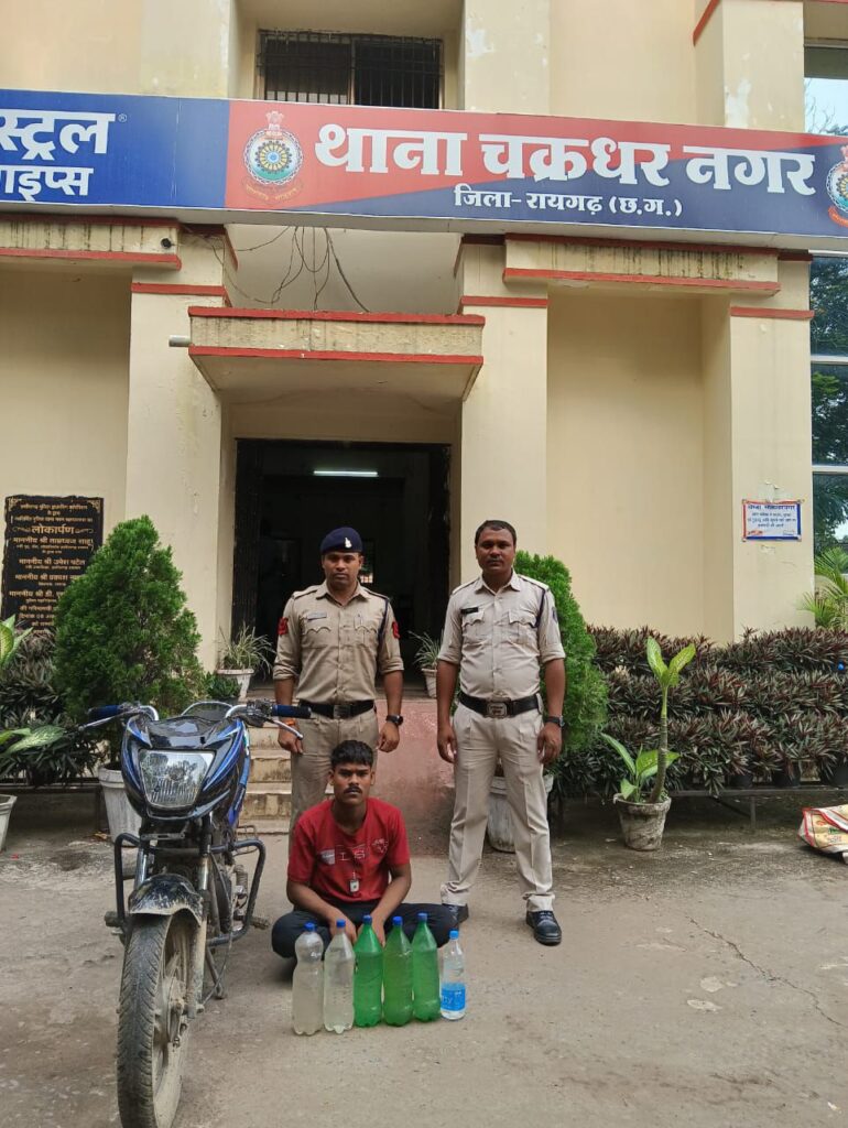 *19 सितंबर, रायगढ़* । एसपी श्री दिव्यांग कुमार पटेल के निर्देशन पर अवैध शराब पर जिले में अभियान स्तर पर कार्रवाई जारी है । इसी कड़ी में आज सुबह थाना चक्रधरनगर के प्रभारी निरीक्षक प्रशांत राव आहेर के नेतृत्व में पुलिस टीम ने पहाड़ मंदिर रोड के समीप अवैध शराब तस्करी के खिलाफ कार्रवाई को अंजाम दिया। टीआई प्रशांत राव को मुखबिर से सूचना प्राप्त हुई थी कि ढिमरापुर पुरानी बस्ती का निवासी दुर्गा प्रसाद जांगड़े अपनी बिना नंबर की मोटरसाइकिल (फैशन प्रो) में बड़ी मात्रा में अवैध महुआ शराब लेकर बिक्री करने के लिए जा रहा है।