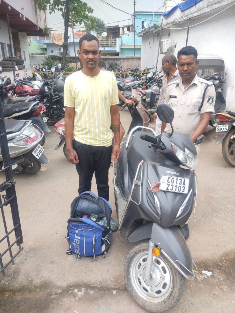 *20 सितंबर, रायगढ़* । एसपी श्री दिव्यांग कुमार पटेल के निर्देशन पर अवैध शराब पर कार्रवाई जारी है । कल थाना जूटमिल पुलिस द्वारा शराब रेड कार्रवाई के तहत अवैध शराब तस्करी में संलिप्त एक युवक को गिरफ्तार किया गया है। टाउन पेट्रोलिंग के दौरान मुखबिर की सूचना पर पुलिस ने आरोपी को झोपड़ीपारा गली दुर्गा चौक पर शराब तस्करी करते हुए युवक को पकड़ा। आरोपी विशाल सारथी पिता ध्रुव कुमार सारथी, उम्र 24 वर्ष, निवासी ग्राम धनागर, स्कूटी एक्टिवा (क्रमांक CG-13-AZ-3103) में 57 पाव देशी प्लेन मदिरा परिवहन कर रहा था।