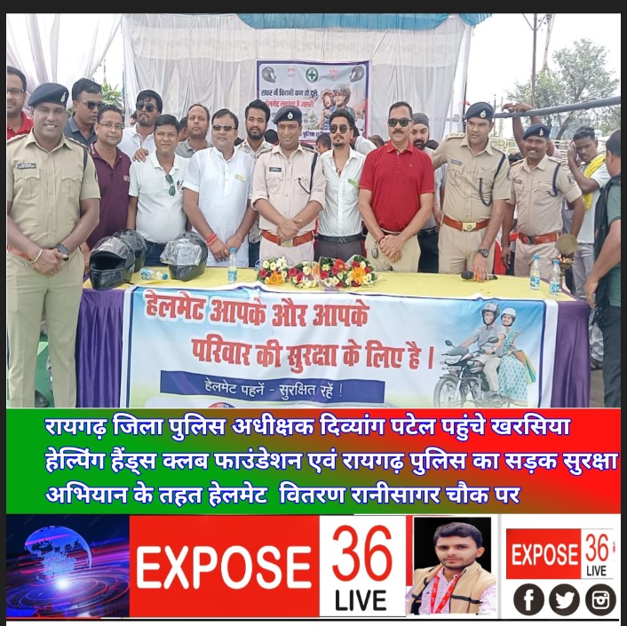 खरसिया। हेल्पिंग हैंड्स क्लब फाउंडेशन एवं रायगढ़ पुलिस प्रशासन के द्वारा आज रानीसागर चौक में सड़क सुरक्षा अभियान चलाया गया जिसमे रायगढ़ जिला पुलिस अधीक्षक दिव्यांग पटेल मुख्य अतिथि के रूप में सामिल हुए एसपी दिव्यांग पटेल एवं संरक्षक मनोज गोयल द्वारा दीप प्रज्ज्वलित कर कार्यक्रम का शुभारंभ किया गया। वही कार्यकर्म में खरसिया एसडीओपी प्रभात पटेल थाना प्रभारी योगेश साहू, चौकी प्रभारी संजय नाग हेल्पिंग हैंड्स क्लब फाउंडेशन के संरक्षक बंटी सोनी ,मनोज गोयल,अध्यक्ष अंकित अग्रवाल सहित नमन अग्रवाल, बिन्नी सलूजा , अविचल अग्रवाल, हिमांशु अग्रवाल , निलेश अग्रवाल, विकास शारदा , रजत शर्मा, अंबर अग्रवाल, अनिकेत अग्रवाल , राहुल डनसेना , कैलाश शर्मा अन्य मौजूद रहे।