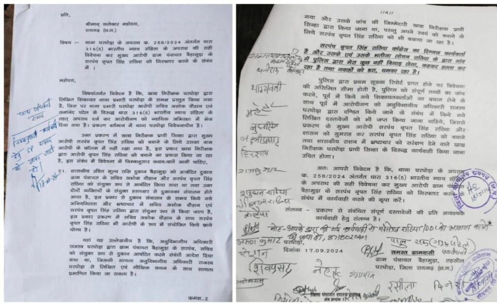 पूरे मामले में घरघोड़ा के बैहामुड़ा के ग्रामीणों की शिकायतों और आंदोलन धरने के लंबे दौर के बाद जागने का अभिनय करने वाले प्रशासन ने ग्राम पंचायत बैहमुड़ा सचिव व सरपंच के द्वारा लाखों के भ्रष्टाचार के मामले की जांच तो की पर जांच रिपोर्ट एस डी एम घरघोड़ा को सौंपने के बाद भी हफ़्तों कार्यवाही के लिए कोई रुचि अधिकारी महोदय द्वारा नही दिखाने पर ग्रामीणों के पुनः आंदोलन की चेतावनी ज्ञापन दिया तब कार्यवाही में थोड़ी गति आयी और सचिव एवं रोजगार सहायक पर FIR दर्ज कर उन्हें गिरफ्तार किया गया पर सरपंच पर किसी प्रकार की कार्यवाही नही हुई इससे बैहामुडा के आंदोलन कारी ग्रामीण बिफर पड़े हैं और सीधे सरपंच को बचाने की कोशिश का आरोप घरघोड़ा के अधिकारी और खाद्य विभाग के अधिकारियों पर लगाते हुए कलेक्टर रायगढ़ को पुनः शिकायत पत्र सौंप कर कार्यवाही की मांग की है ।